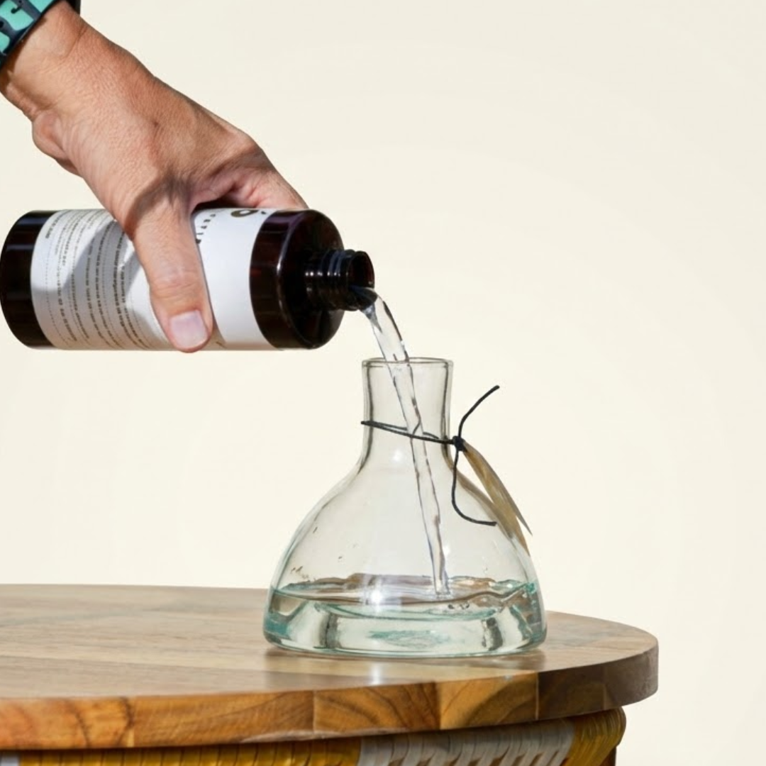 - Vierta la mitad del líquido en el contenedor de vidrio, inserte los palitos, una vez los palitos absorban el perfume, estos lentamente empezaran a esparcir la fragancia en el espacio.