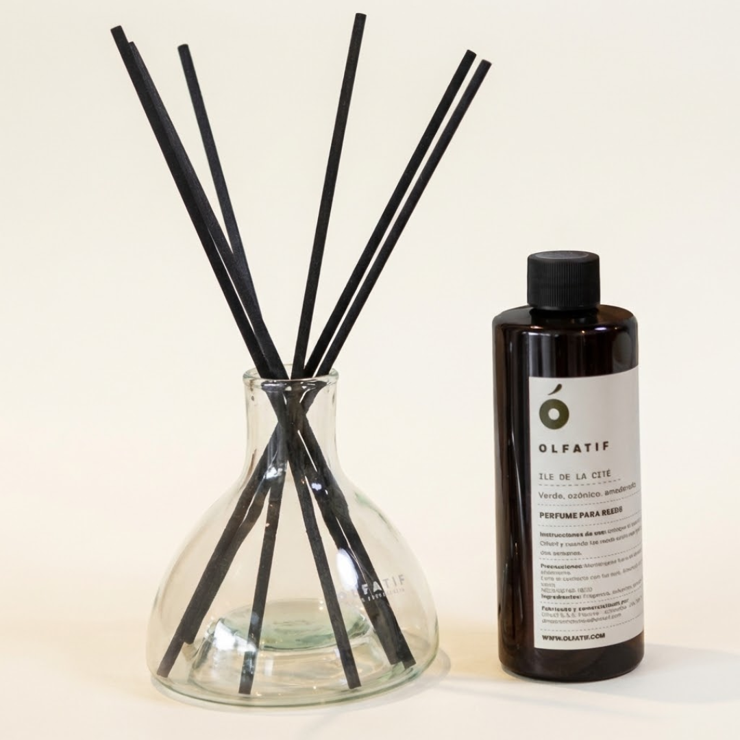 - El envase soplado a mano por artesanos del eje cafetero mantiene el perfume, mientras las varitas de algodón prensado esparcen la fragancia de manera intermitente, elegante y natural.